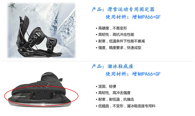 用于低溫環(huán)境及高抗沖零部件,如冰上工具、汽車配件、冰鞋、童車等。